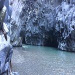 De kloof is ontstaan door een vulkaanuitbarsting in 2400 voor Christus. Door de uitbarsting werd de rivier de Alcantara bedolven onder een laag lava. De aardbeving die daar op volgde zorgde er voor dat de lava gespleten werd en zo ontstond de Alcantara kloof. De ‘wanden’ van de kloof hebben bijzondere vormen doordat het water van de Alcantara er aan alle kanten door bleef stromen. Het water komt rechtstreeks uit de bergen en is kraakhelder. ( geen filter nodig voor je foto’s want het kleurenpallet van dit natuurgebied is al mooi genoeg van zichzelf.) Het water is niet alleen kraakhelder maar ook onwijs koud. Het water is ongeveer 5 graden. En doordat er niet veel zon valt in de kloof warmt het water ook niet op. Ik kon het niet laten en heb mijn broekspijpen opgerold en ben de kloof ingelopen. De kloof is te bereiken met een trap of met een lift. Het park biedt ook verschillende excursies door de kloof. Maar we kozen ervoor om zelf op ontdekking te gaan.
