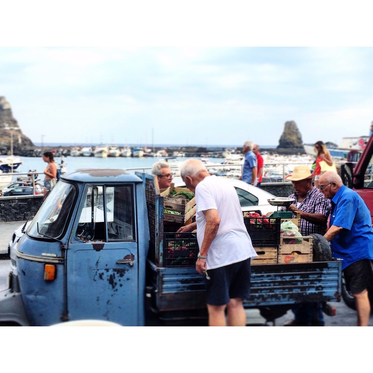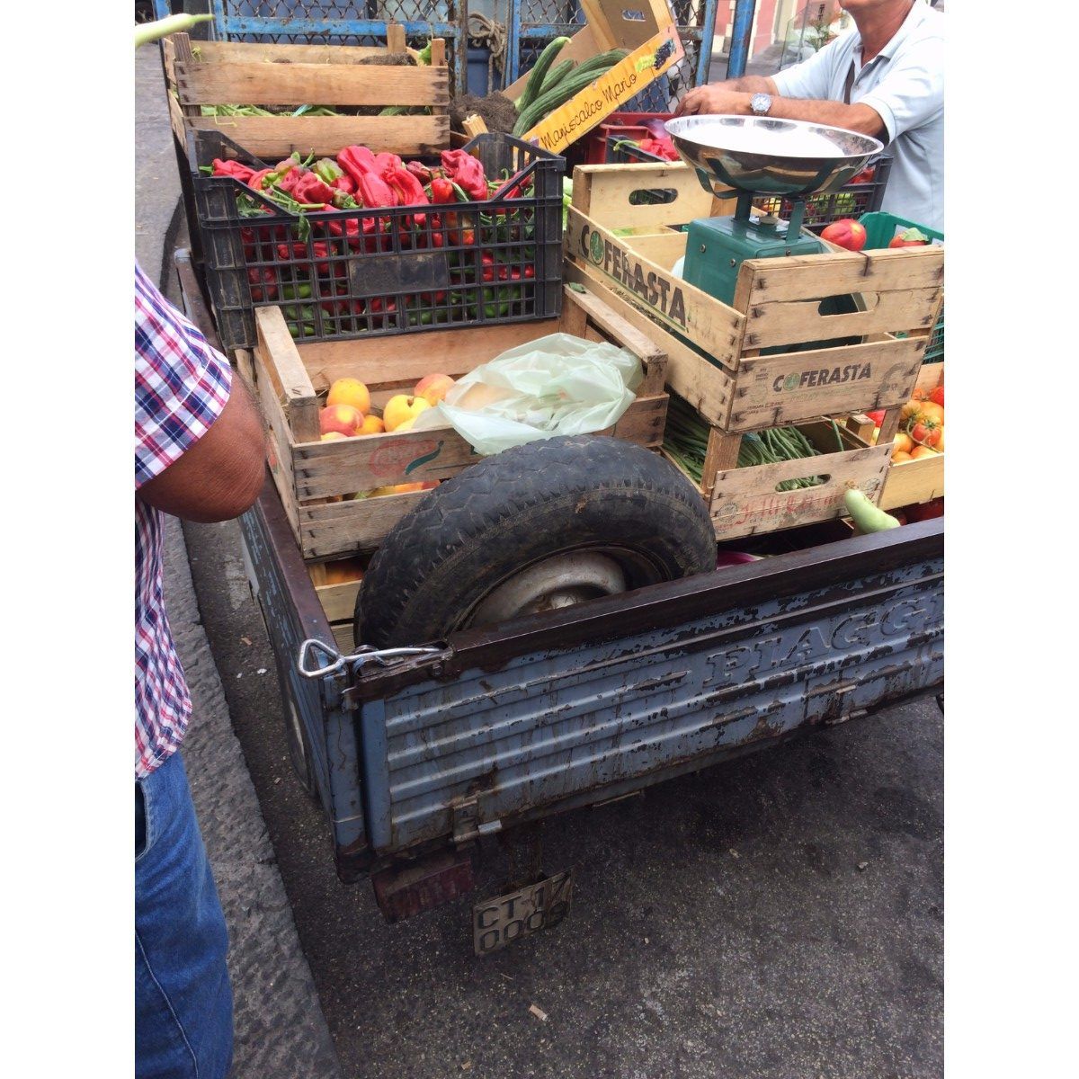 Sicilië heeft de lekkerste groente en fruit. Logisch want de grond van vulkaan Etna is ontzettend vruchtbaar!Als je omhoog rijdt word je omringt door groen. Overal op straat zie je groente en fruit stalletjes op de leukste manieren. Bijvoorbeeld in de achterbak van driewieler auto’s.